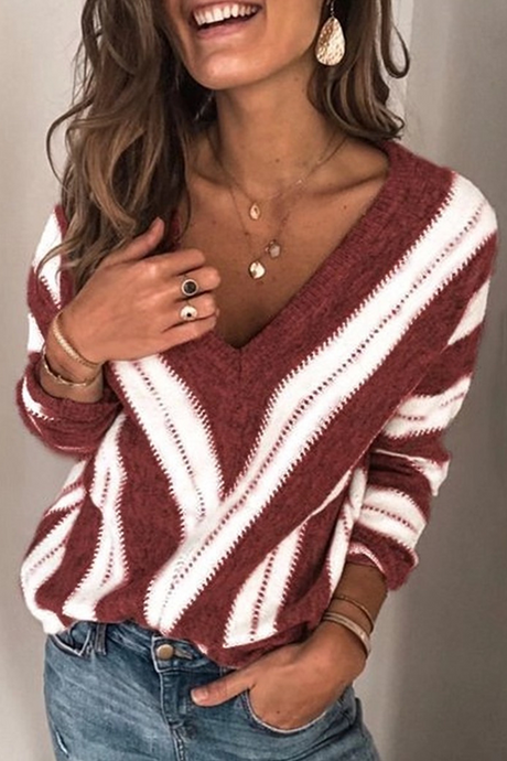 Casual Striped Split Joint Contrast V Neck Tops(5 Colors)